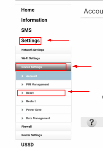 After logging in, navigate to the Settings tab and select Device settings. From there, click on Reset to proceed with resetting the device.