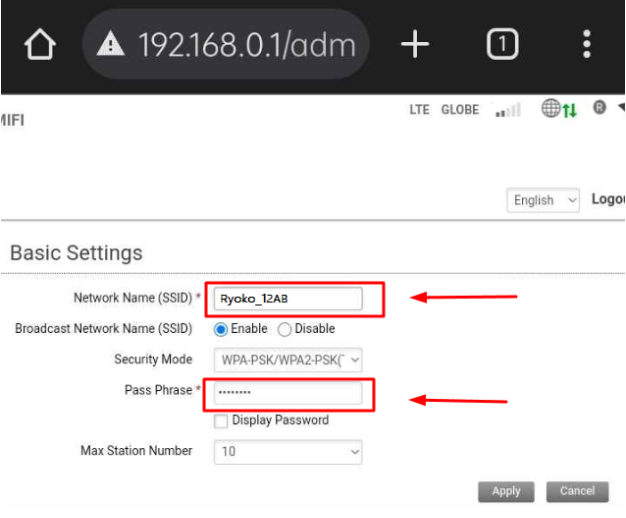 5. On the “Basic settings page” you can change your preferred network name in the "Network name" (SSID) and your password in the "Pass Phrase." Simply delete the current information in the box and enter your preferred network name SSID and password. Please ensure that the password you chose should be at least 8 characters long, a mix of letters and numbers, and is case sensitive