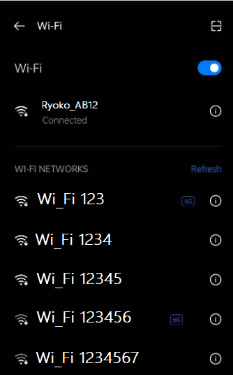 Connect the device to the Ryoko by going to the Wi-Fi settings and locating the Ryoko’s SSID name on the list of network devices.