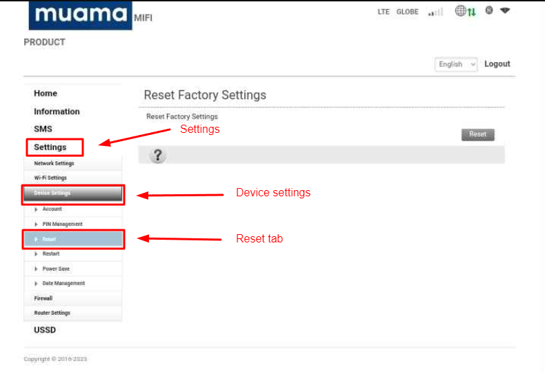 Once logged in, you can now access the settings on the web management page. From there, go to Device settings, then Reset.